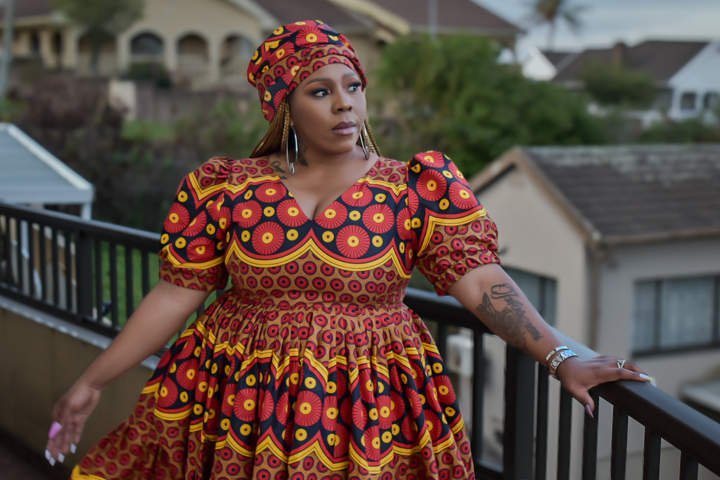 Step out in style with the Inzwakazi Red Dress, featuring a lovely shweshwe pattern and a matching doek.