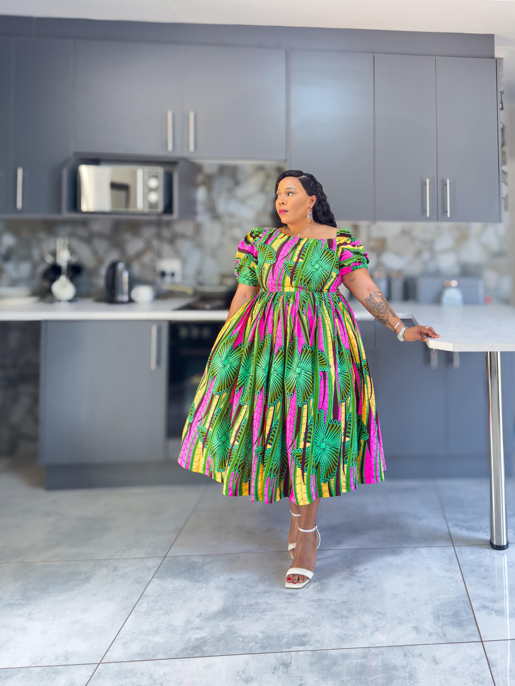 This Protea dress is perfect for any occasion. The soft fabric feels great, and the pockets add extra convenience. One Arm of the shoulder stretchy sleeves make it easy to wear all day.