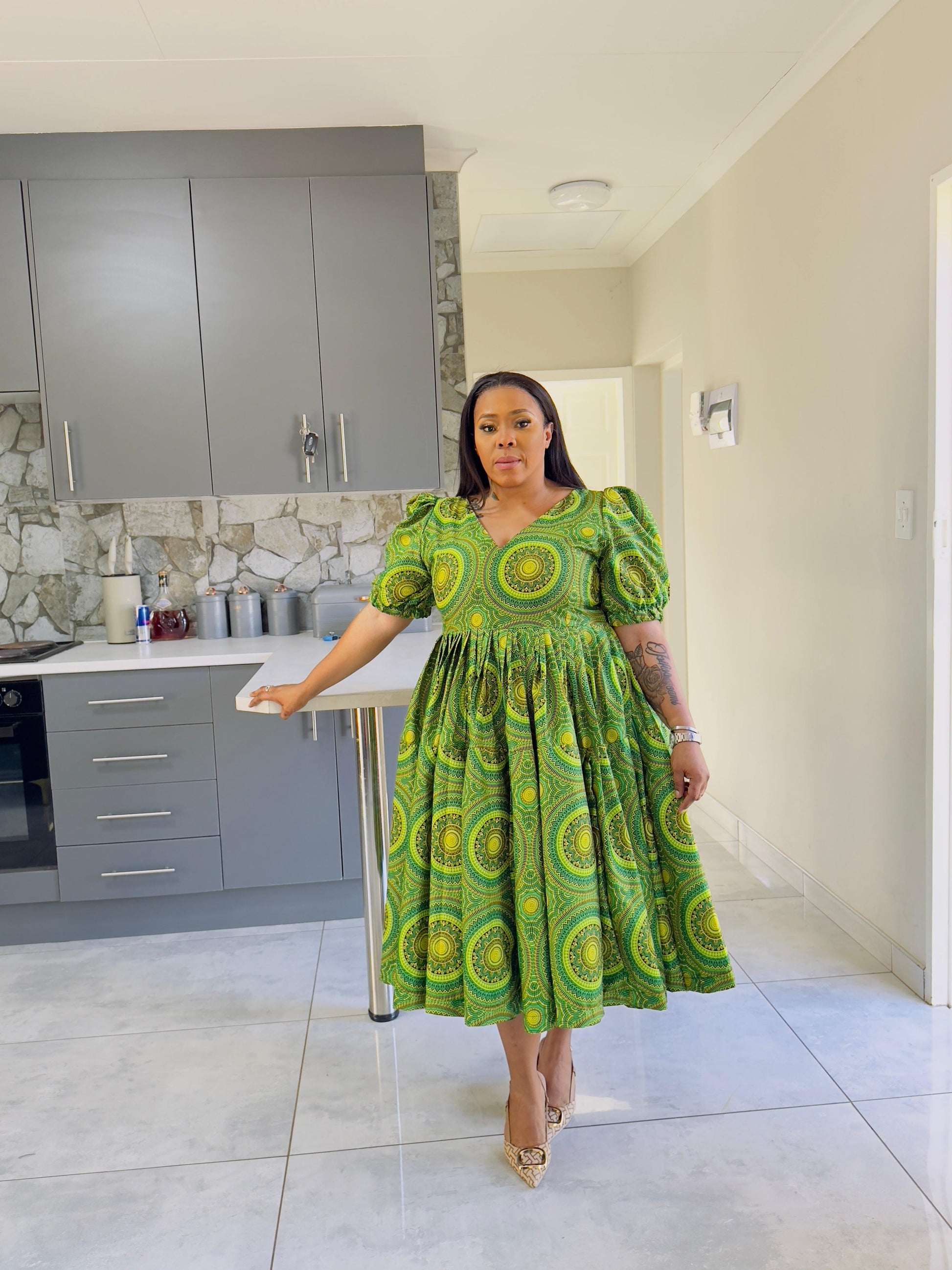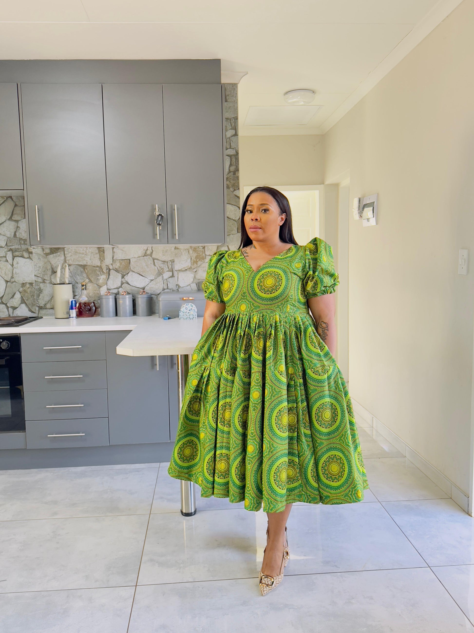 This dress is perfect for any occasion It comes with a matching Doek. The soft fabric feels great, and the pockets add extra convenience. The below-knee length and short stretchy sleeves make it easy to wear all day